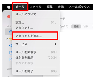 標準メールを開き上部【メール】→【アカウントを追加…】の順に選択します。