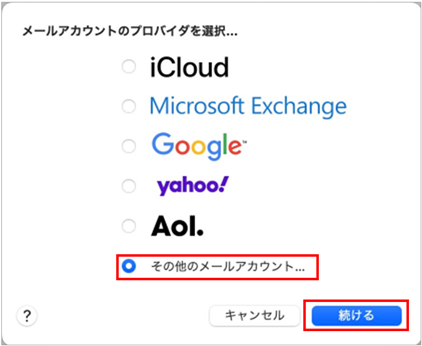 「その他メールアカウント…」にチェックを入れ【続ける】を選択します。