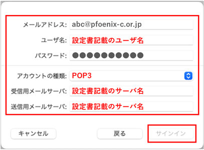 | 受信用メールサーバ | 設定書記載のサーバ名 |
