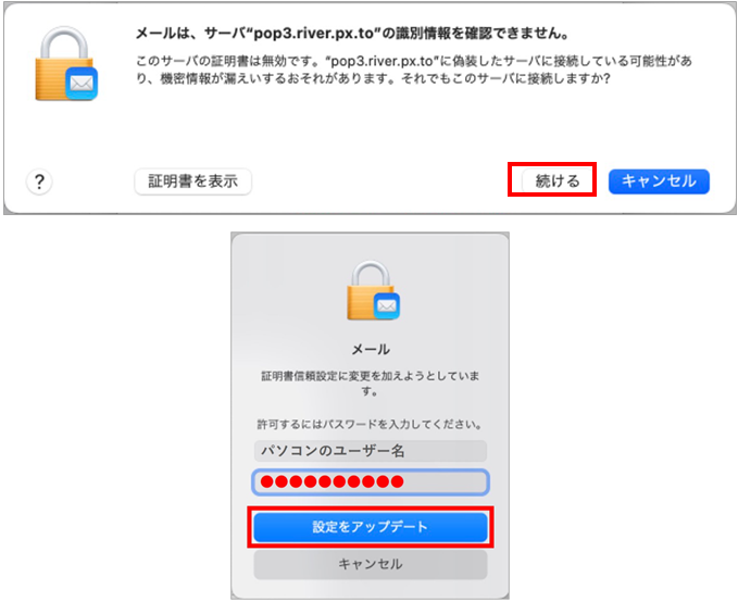 上記エラーが表示される場合は【続ける】を選択し、お使いのパソコンのパスワードを入力後