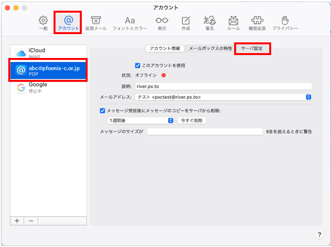 【アカウント】→【登録したメールアドレス】→【サーバ設定】の順に選択します。