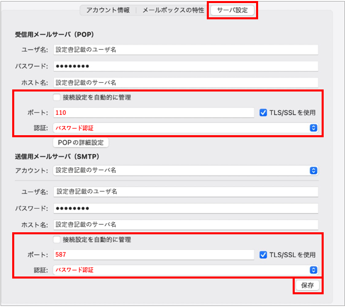 各サーバ情報を下記の通り入力後【保存】を選択します。