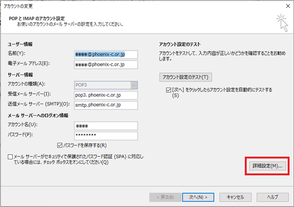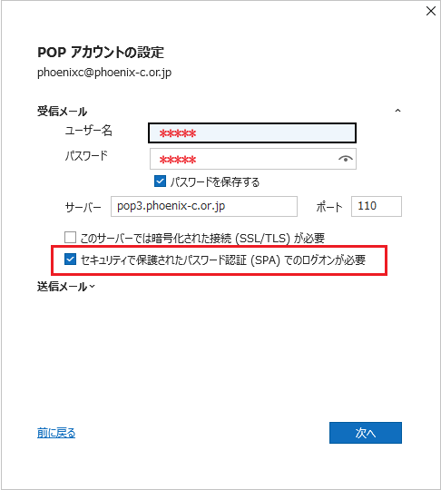 【ユーザー名 ~ でサーバー pop3.phoenix-c.or.jp へのログインに失敗しました。】