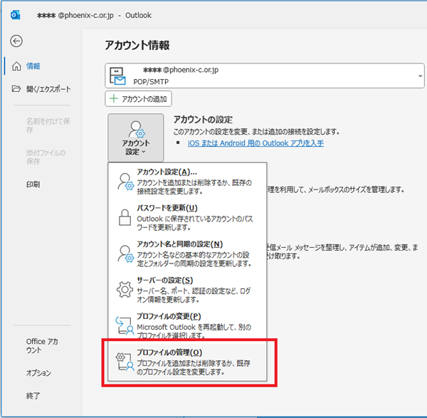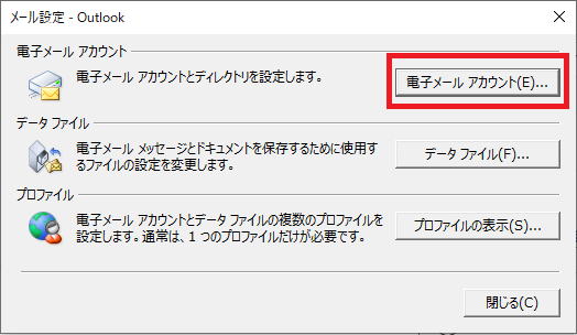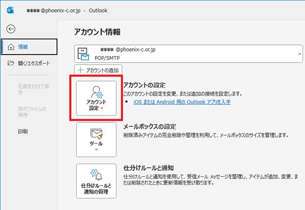 【ファイル】→【アカウントの情報】の中の【アカウントの設定】をクリックしてください。