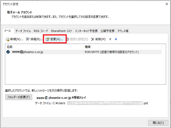 【電子メール】タブを選択して対象のアカウント名を選択後、【変更 (A)…】をクリックします。