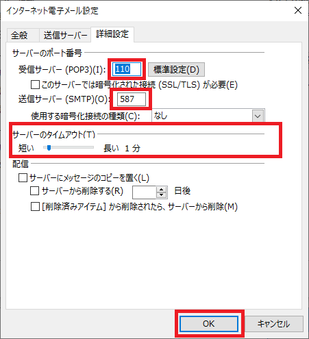【サーバーのタイムアウト】を変更します。変更後、【OK】をクリックし、アカウント変更を完了したら設定変更完了です。