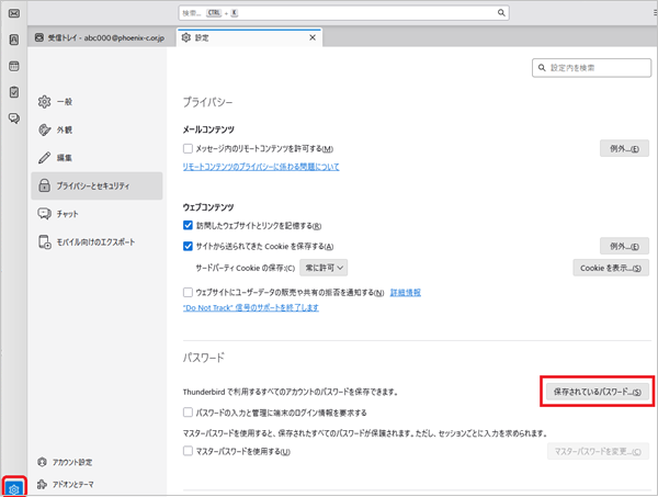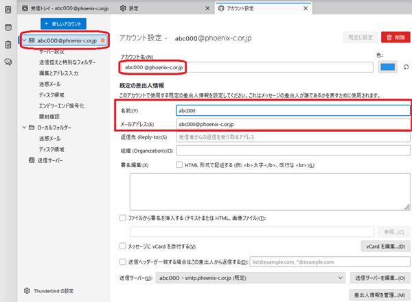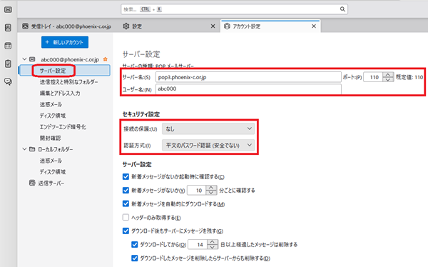 | 受信用メールサーバー | pop3.phoenix-c.or.jp | pop3. + ドメイン(メールアドレスの@マークより右側) 例:【example@px-c.net】の場合【pop3.px-c.net】 |