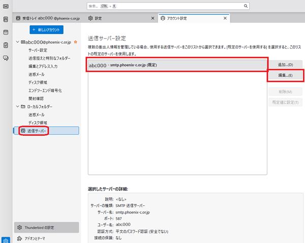 【送信サーバー】から【編集】をクリックすると送信(SMTP)サーバーの設定内容を確認できます。