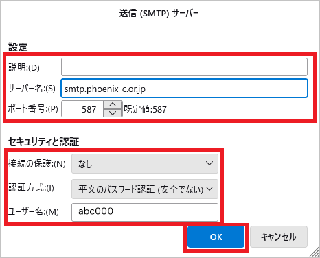 【サーバー設定】の送信用メールサーバーの情報が正しいか設定内容通知書をご用意いただき、確認してください。ご確認、ご修正ただきましたら、【OK】をクリックし、設定変更完了です。