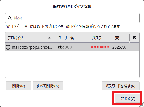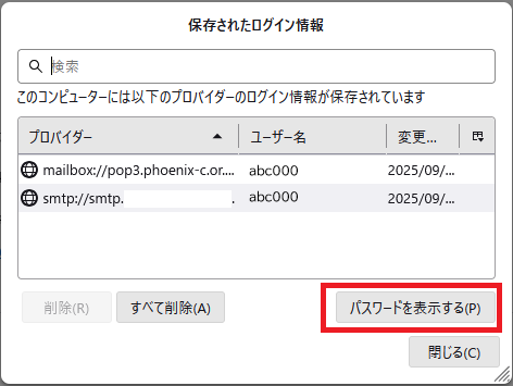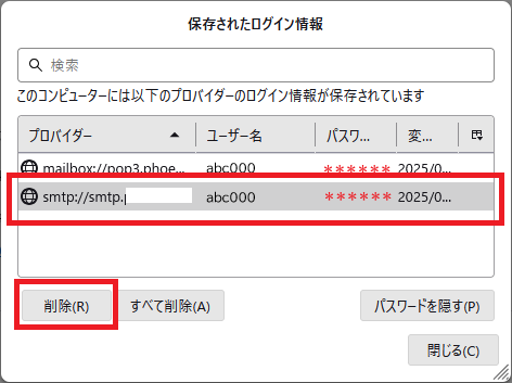 表示されたパスワード一覧から削除したいものを選択し【削除】をクリックします。
