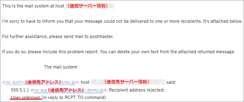 ・「Host or domain name not found」「User Unknown」の文字列がある場合