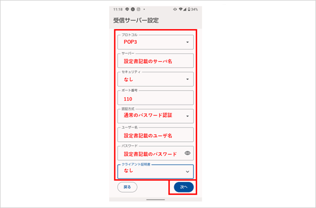 「受信サーバー設定」の各項目に下記情報を入力し、【次へ】を選択します。