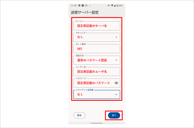 「送信サーバー設定」の各項目に下記情報を入力し、【次へ】を選択します。