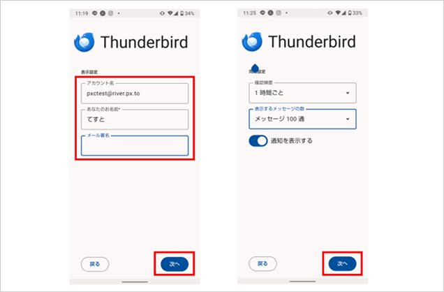 「あなたのお名前」「メール署名」に任意で入力し、【次へ】を選択します。