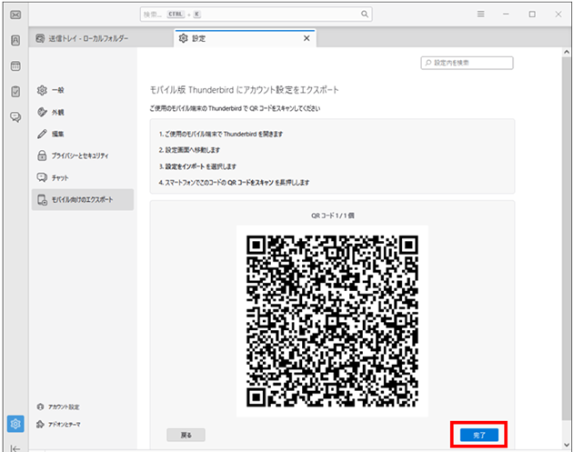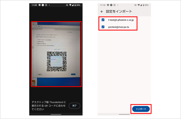 QRコード読み込み画面にて、パソコン版のThunderbirdで作成したQRコードを読み取り、登録したいメールアドレスが確認出来たら【インポート】を選択します。