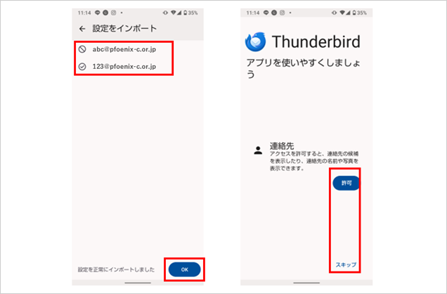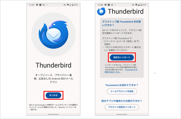 「Thunderbird」のアプリを開き、【はじめる】を選択後、【設定をインポート】を選択します。