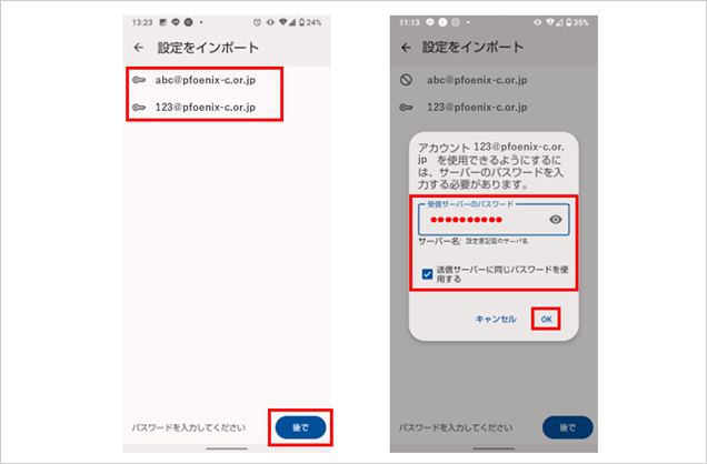 メールアドレスを選択すると、パスワード入力画面が表示されるので、登録したいメールアドレスのパスワードをそれぞれ入力します。