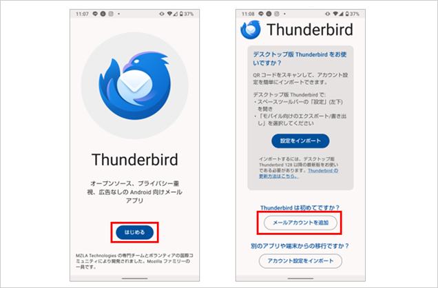 「Thunderbird」のアプリを開き、【はじめる】を選択後、【メールアカウントを追加】を選択します。